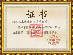 雙龍戲珠酒業(yè)作為福建省白酒研發(fā)中心,榮獲福建老字號產(chǎn)品、福建省農(nóng)業(yè)產(chǎn)業(yè)化龍頭企業(yè)、福建東南窖酒文化館、科技小巨人領(lǐng)軍企業(yè),國家守合同、重信用單位等榮譽。